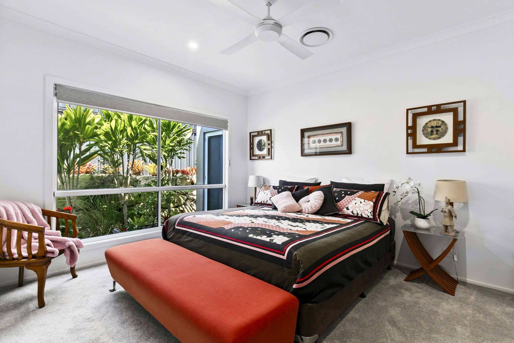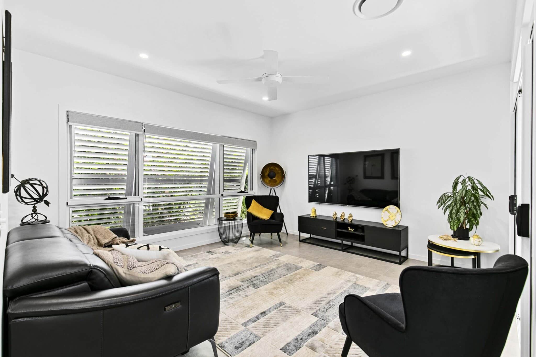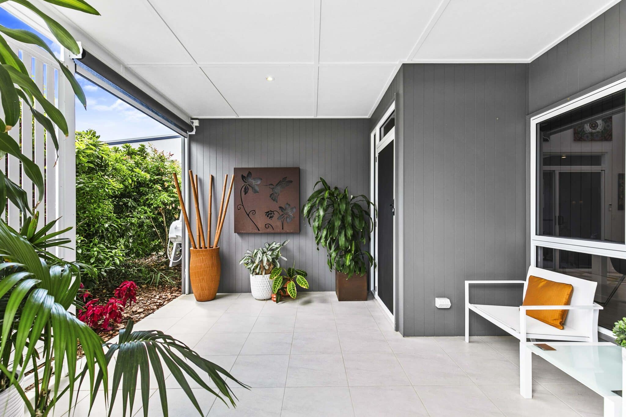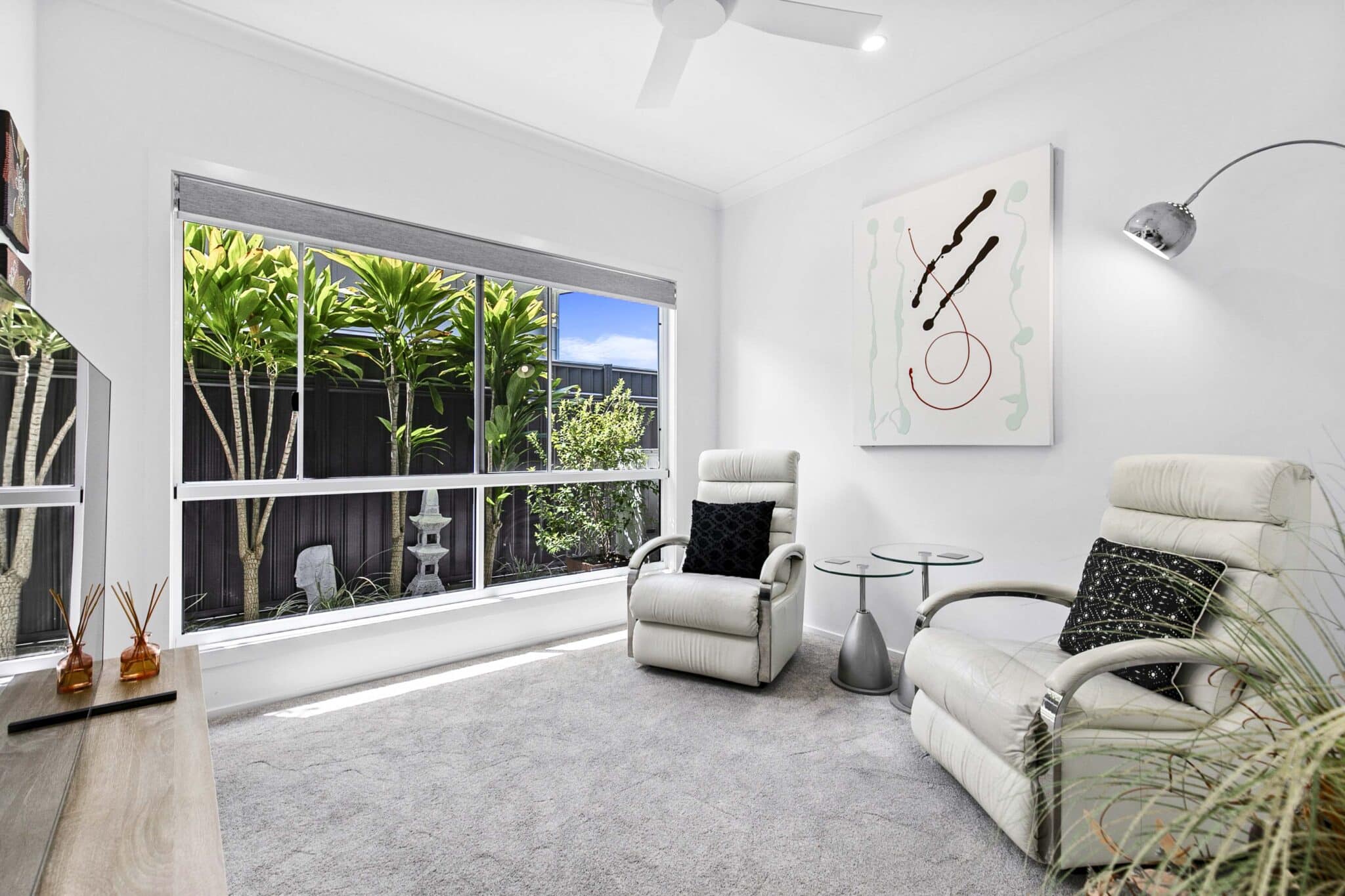 Bahama Shutters on the external front living window and on the raked ceiling louver windows gives protection from the elements and additional privacy, yet still allows light and air flow into the home. Front windows, both bedrooms and MPR feature motorised day/night blinds. A four-zone ducted air conditioning system and ceiling fans throughout, along with upgraded Crimsafe screen doors on the front, laundry and garage doors, allows beautiful breeze flow from front to back of the home and provides for smart energy consumption. The home has a 5.35Kw Solahart solar system.