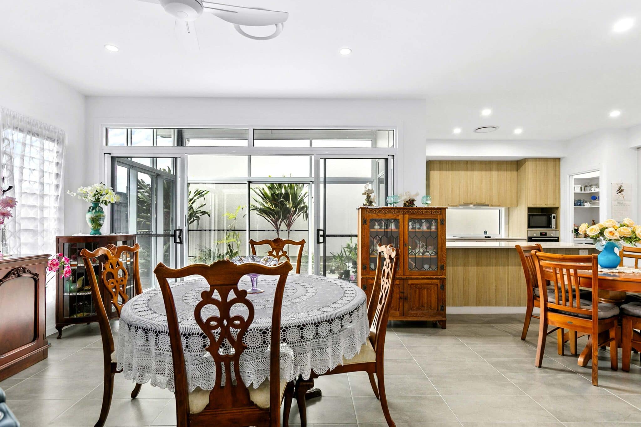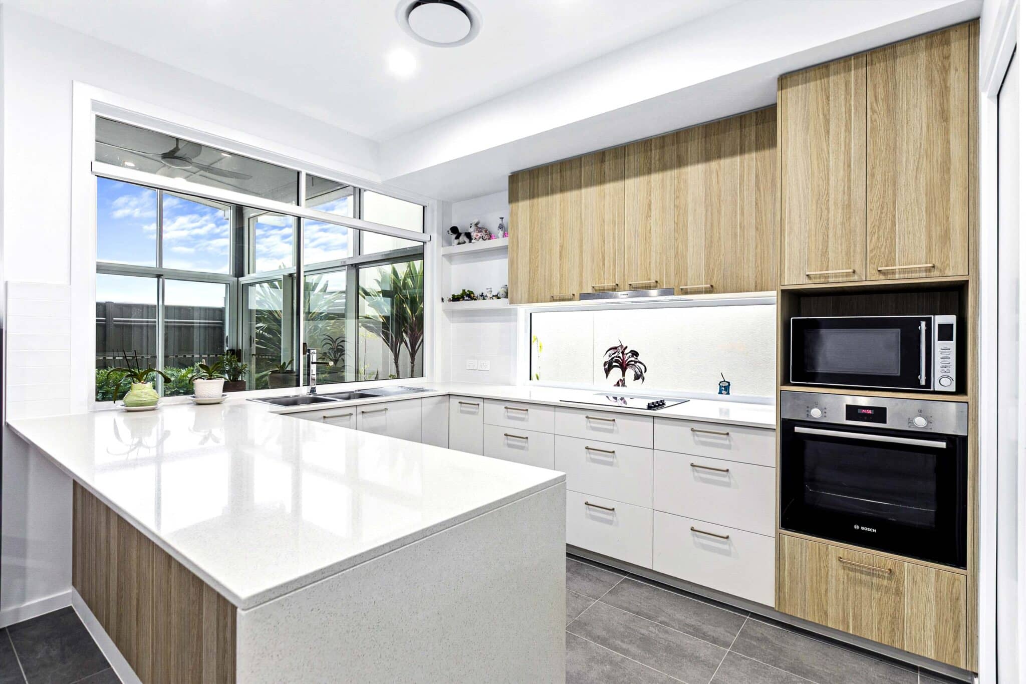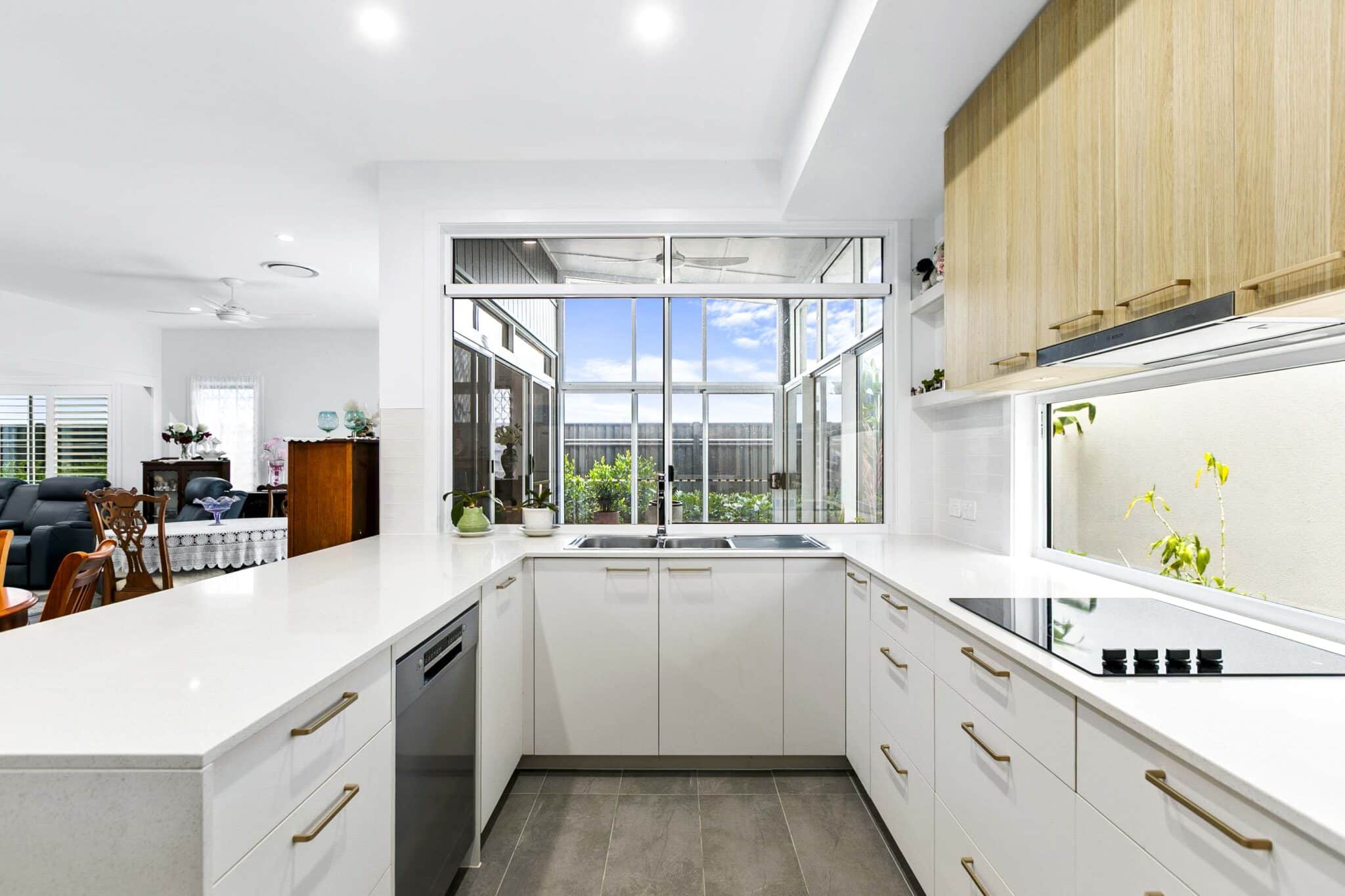 Feature glass window splashback and generous window above the sink allows additional light into your kitchen as you bake and prepare meals whilst overlooking the alfresco out to the garden. The rear alfresco has had the unique addition of custom sliding doors, fully encasing this outdoor space, the choice is yours to have the doors open or closed.