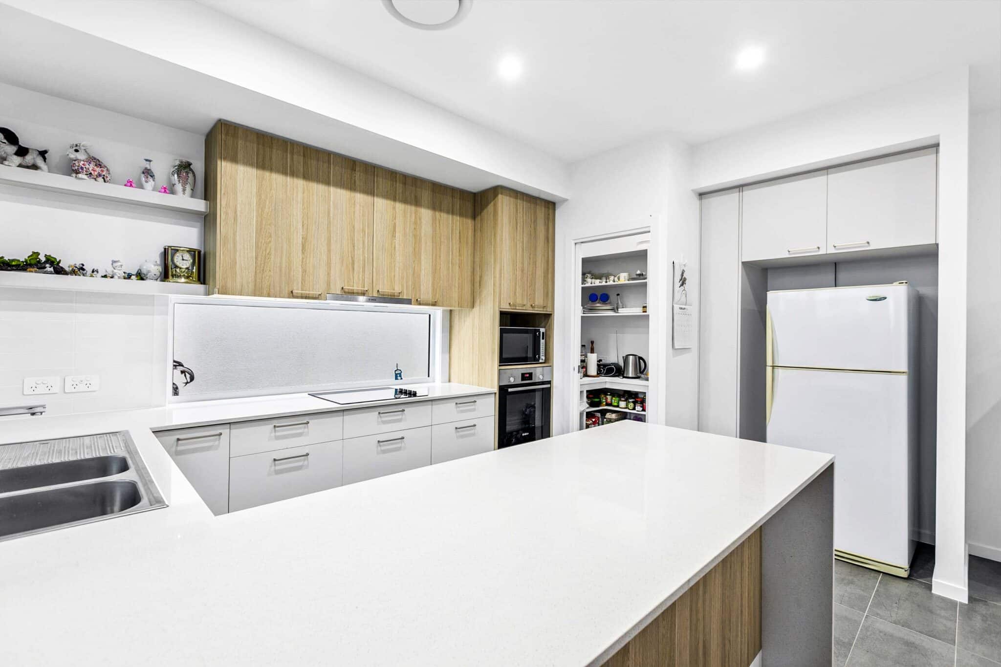 An abundance of bench space and storage feature in this lovely kitchen, featuring a walk-in pantry . Waterfall stone bench top, cabinetry with additional soft-close drawers, water access point in the fridge cavity and quality Bosch electric cooktop, rangehood, oven and dishwasher makes this kitchen an entertainer’s delight.