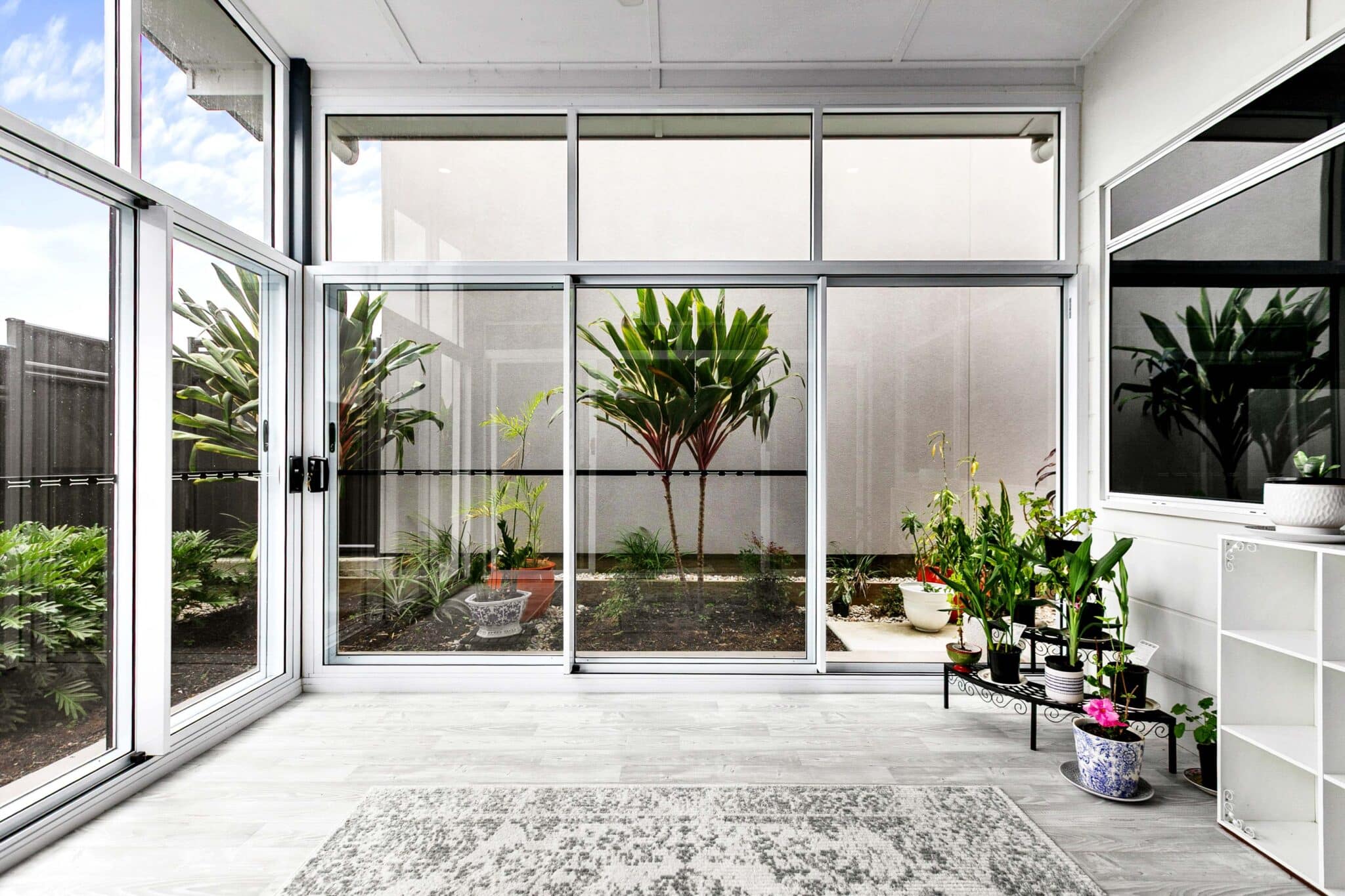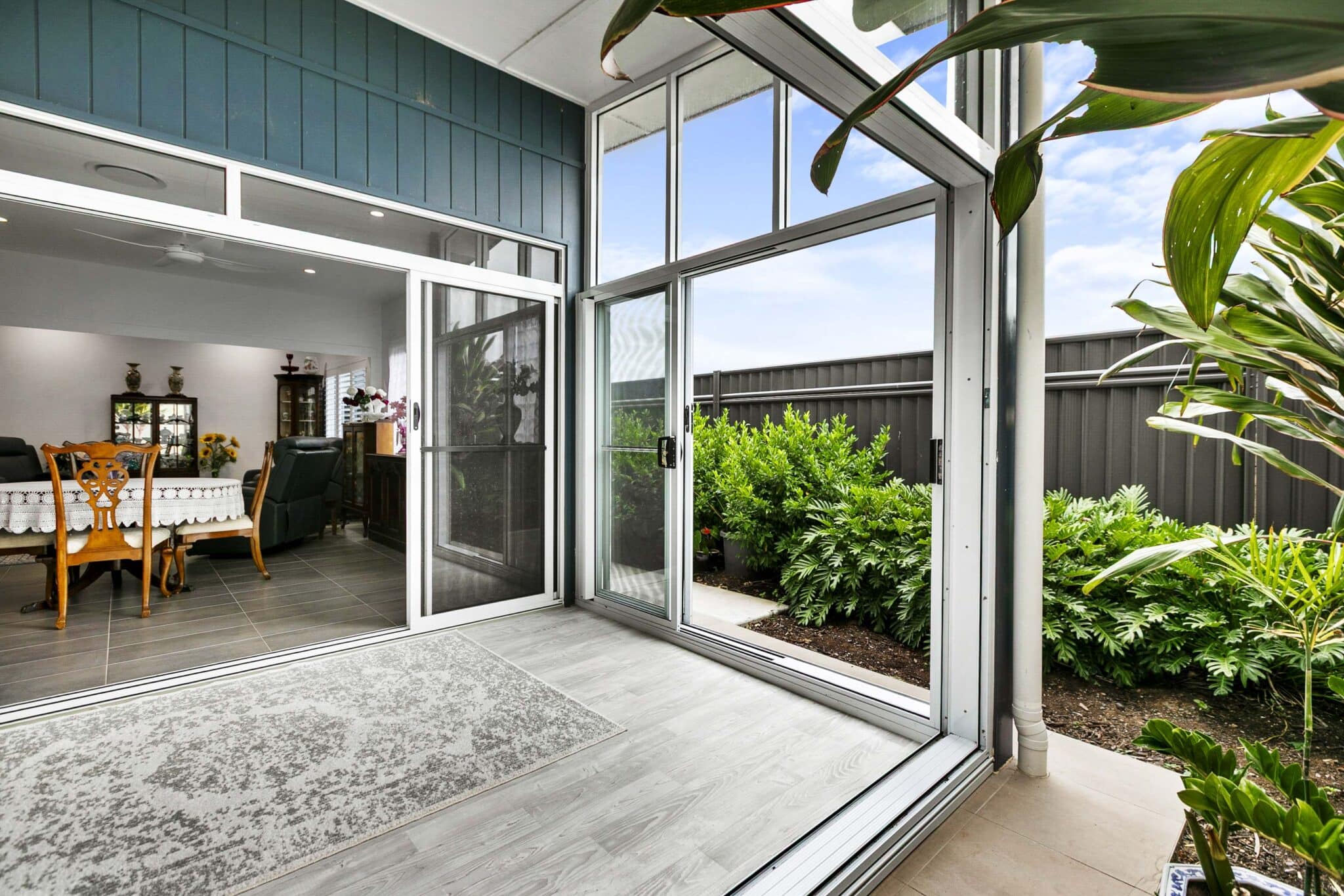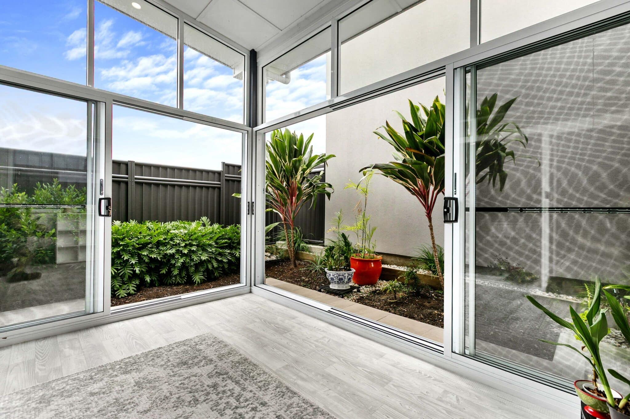 - All window and doors feature grey glass and aluminium screens