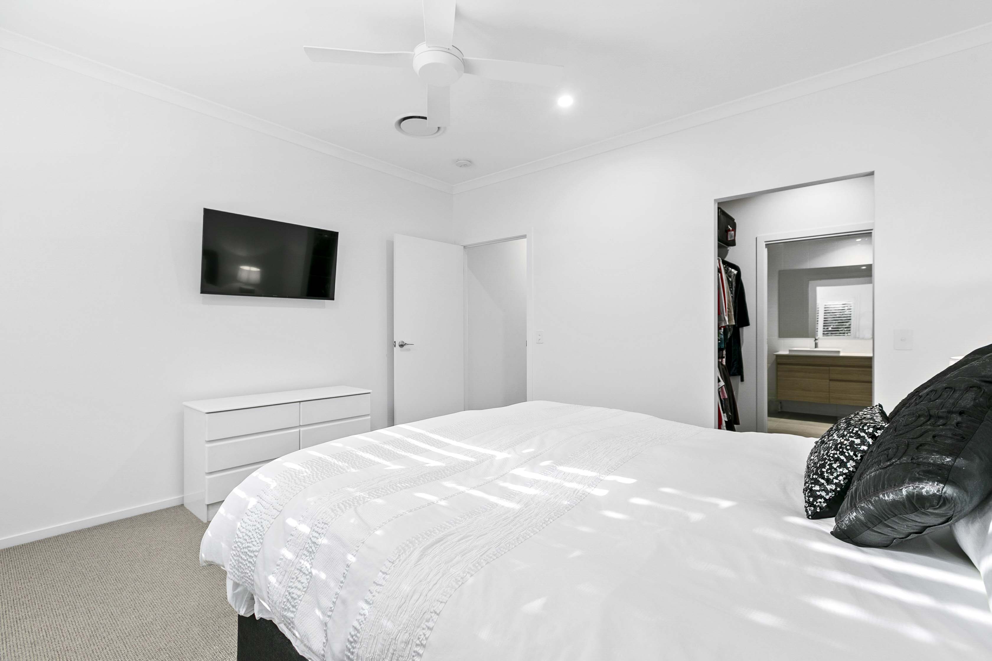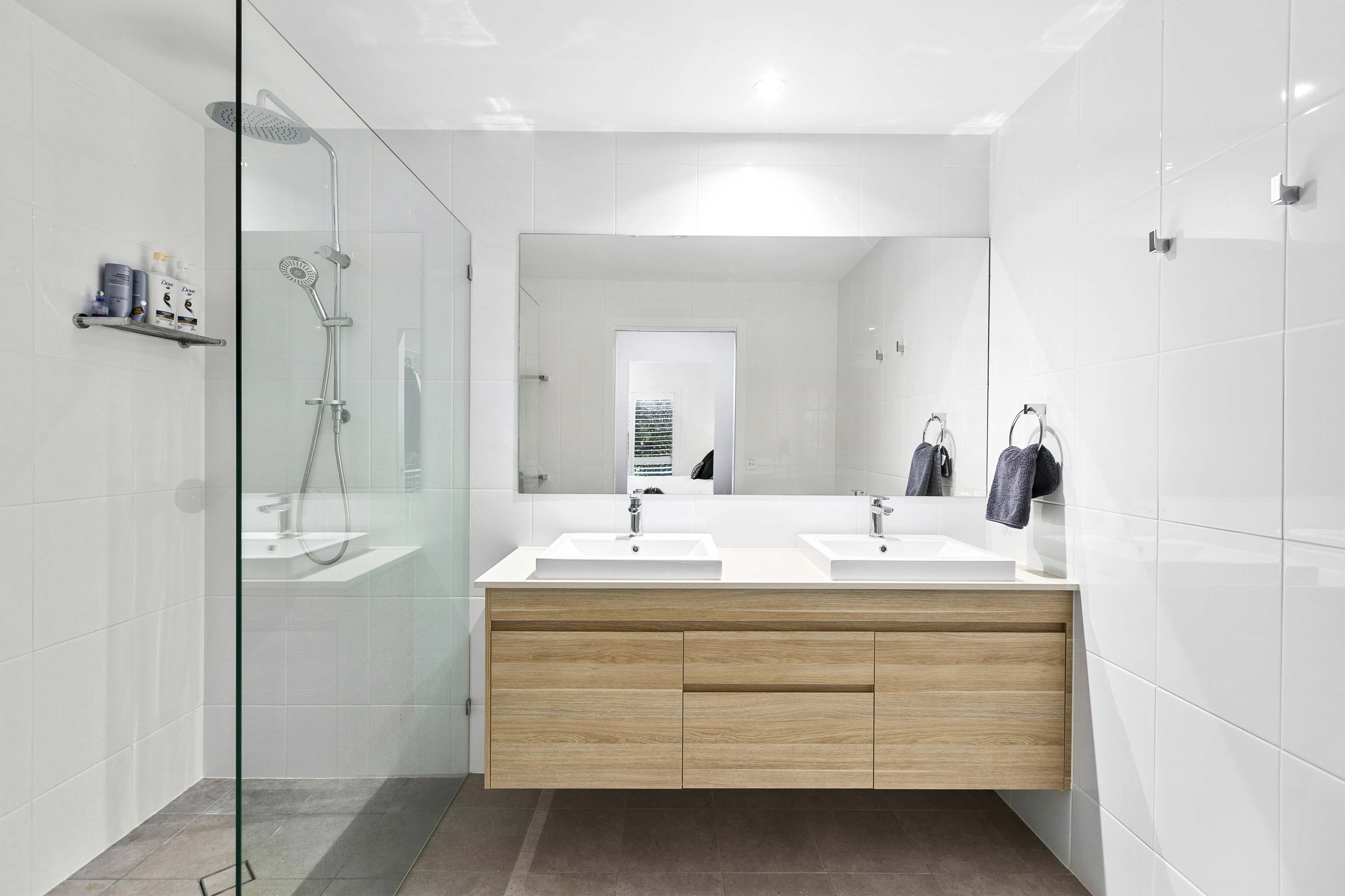 The smart layout includes two guest bedrooms and bathroom at the front, while the spacious master suite with walk-in robe and luxury ensuite sits privately at the rear. Bathrooms feature stone vanities, walk-in showers, and floor-to-ceiling tiles.