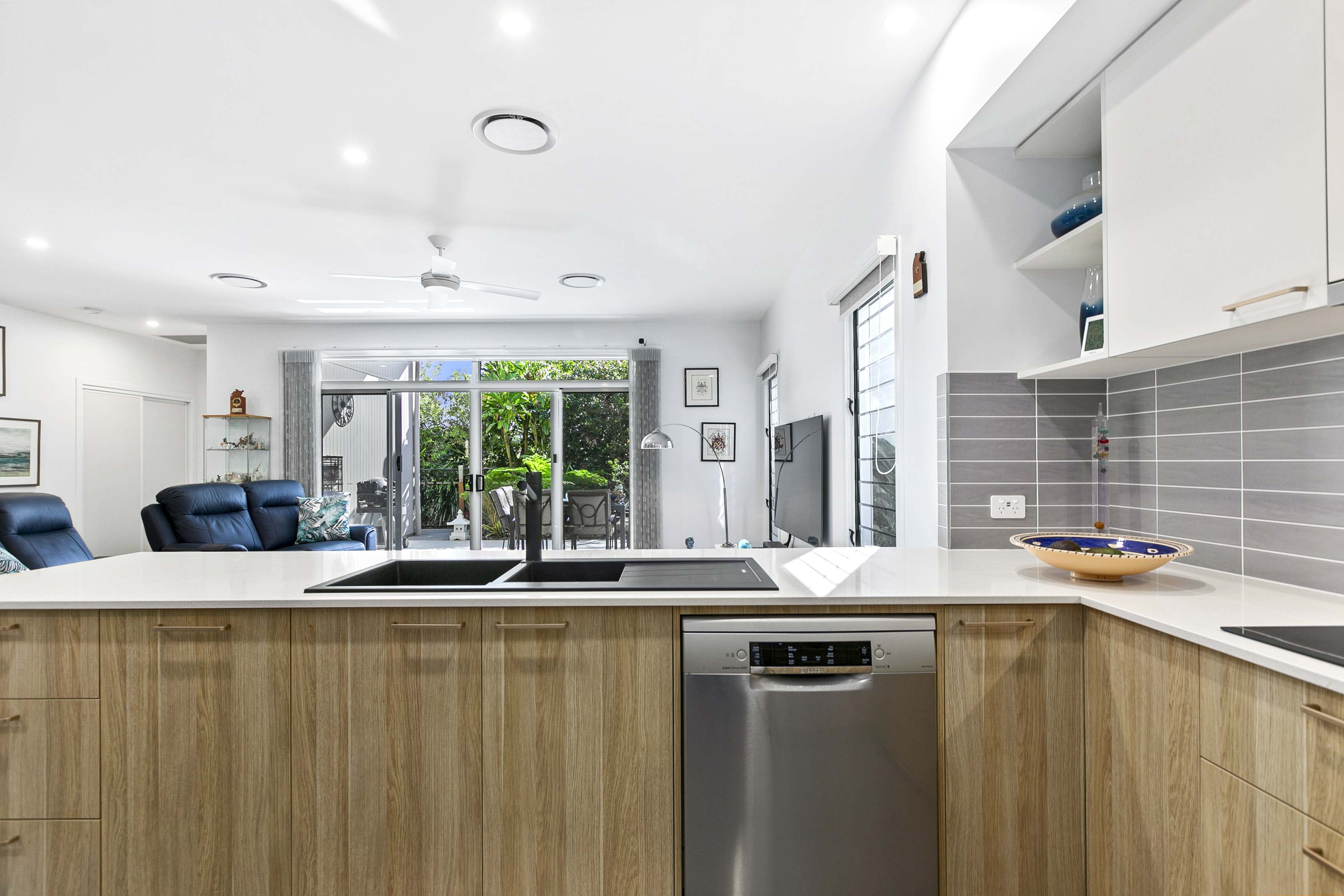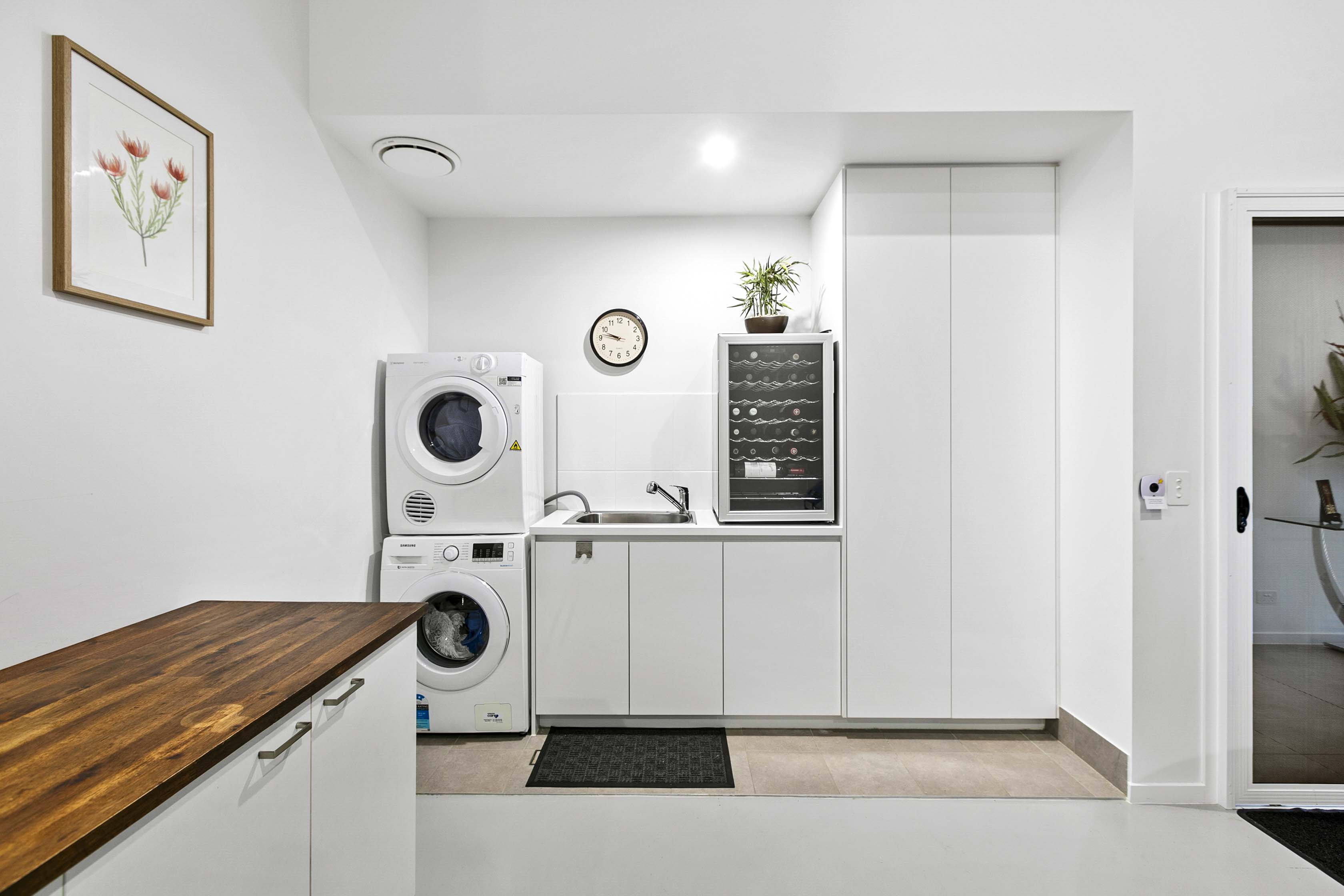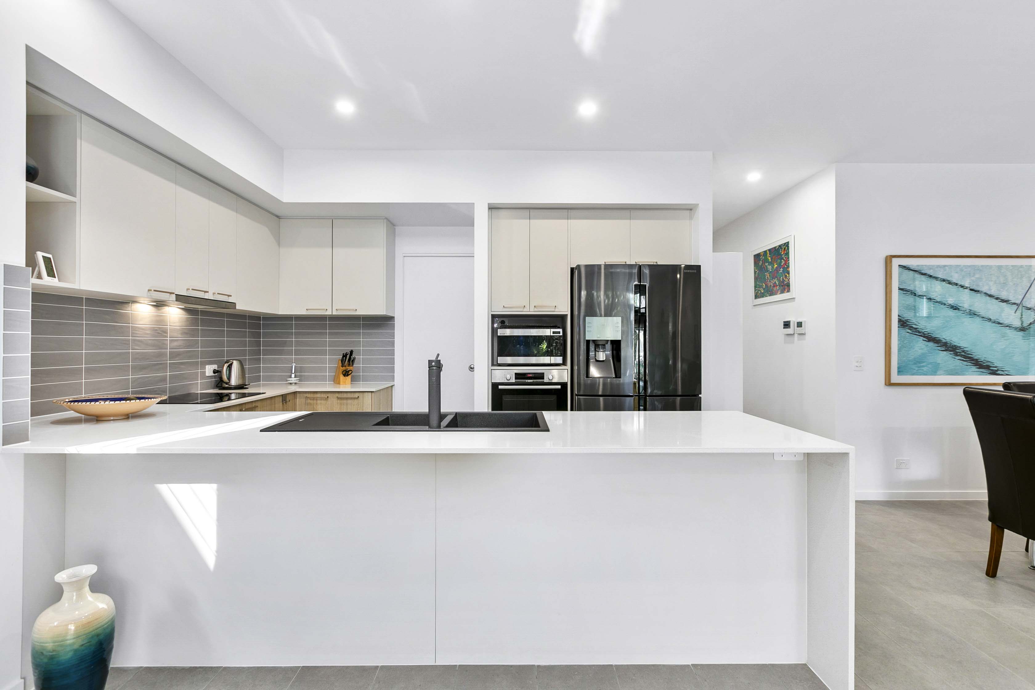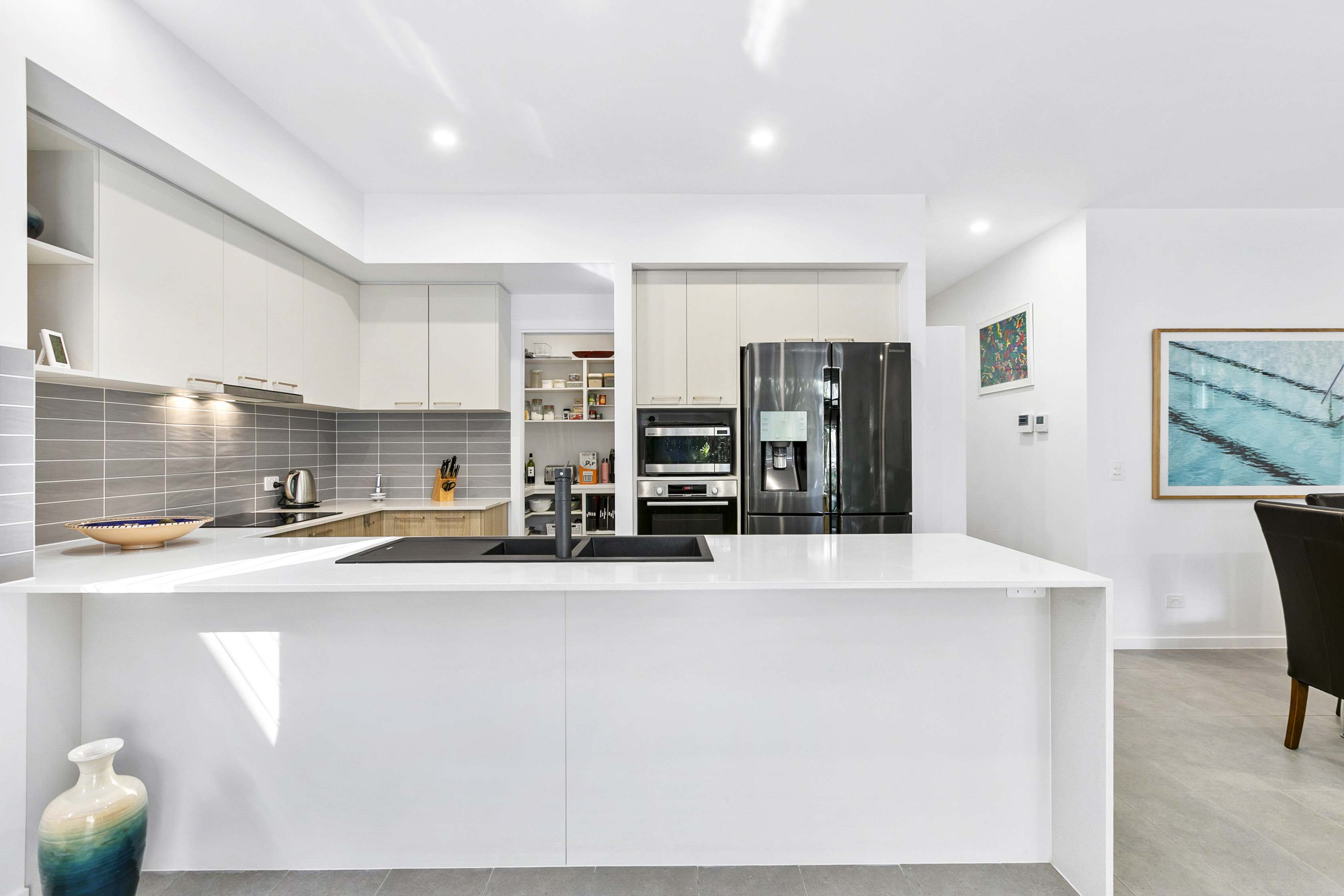 Inside, the modern kitchen boasts a walk-in pantry, upgraded Bosch appliances, induction cooking, pyrolytic oven, and a waterfall stone benchtop. Oliveri fittings and thoughtful details like extra GPOs and fridge water point make it a joy to cook and entertain.