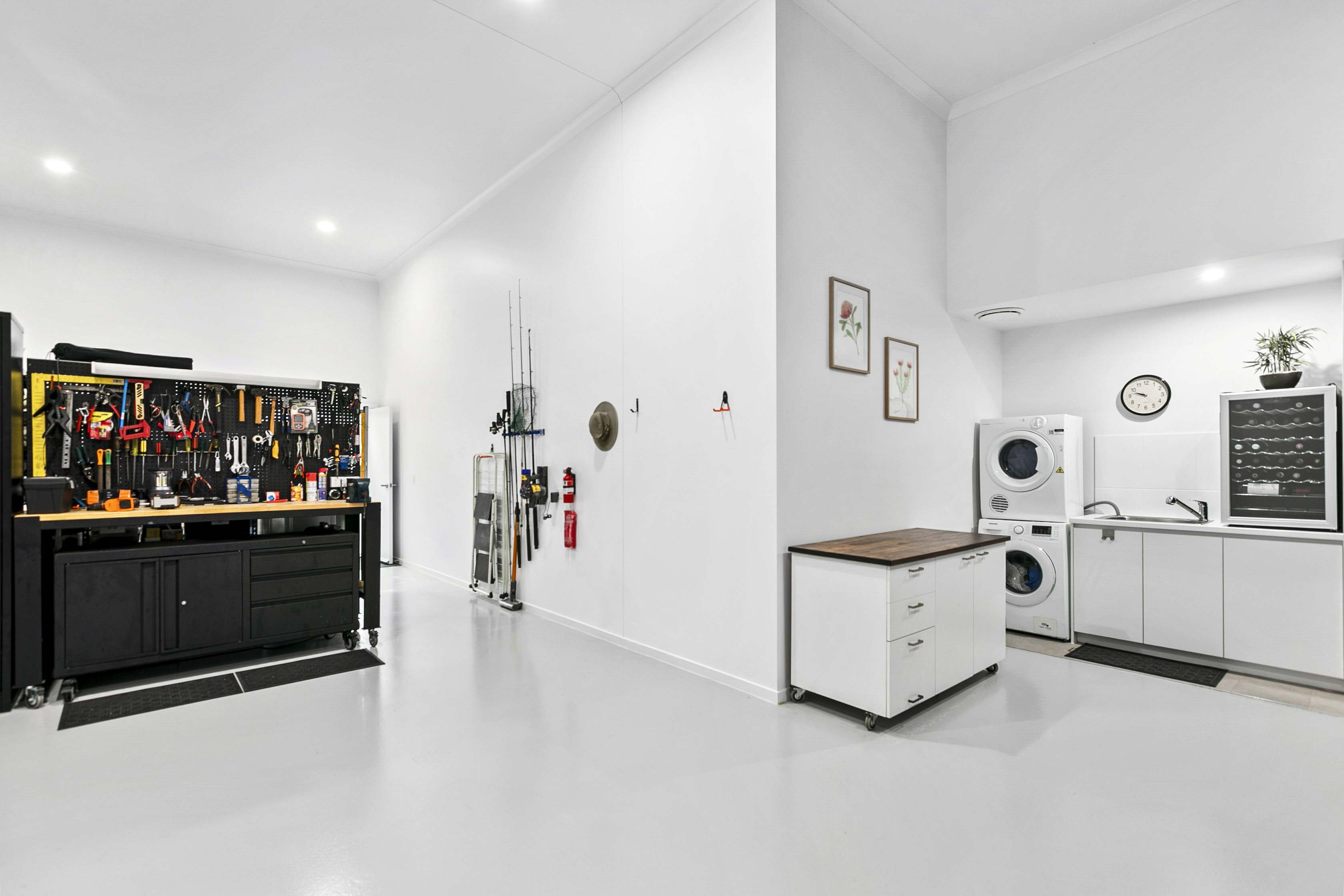 The huge 80m² epoxy-finished RV garage with 3.6m clearance and 15amp GPO is ideal for your van, boat or hobby setup. A water point and internal laundry add even more convenience.